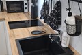 Холодильник, морозилка, 2-комфорочная электроплита, вытяжка, раковина, микроволновка, чайник, капсюльная кофемашина, столовые приборы, газовый котёл.