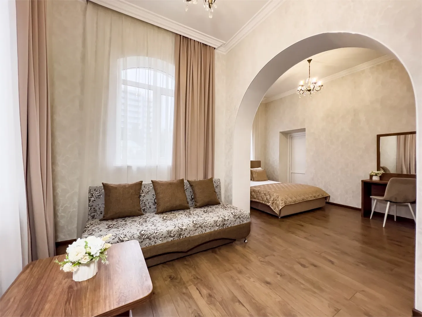 Номер рассчитан для размещения до четырёх гостей. Номер оснащен одной двуспальной кроватью, раскладным диваном, шкафом для одежды, прикроватными тумбочками, журнальным или косметическим столиком, зеркалом.
