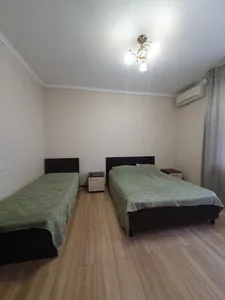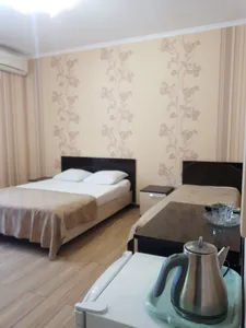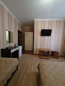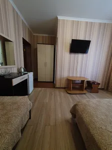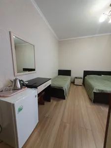 Жили на 3 этаже, был балкончик! уютно) номер досрочно просторный, был холодильник и чайник! Полотенца выдали. Общая кухня внизу, можно приготовить, разогреть еду. До моря близко! Рядом столовые есть.