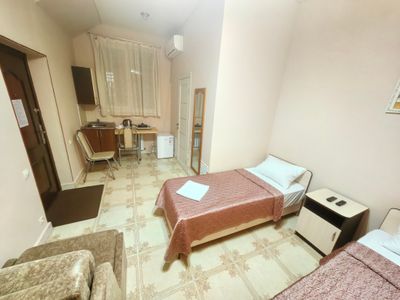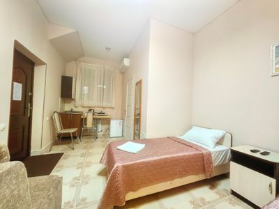Так же имеется в наличии двухкомнатные четырехместные номера и четырехместные номера с балконом. В номере есть все вышеперечисленное кроме кухни. Для номеров данного вида, имеется общая кухня во дворе дома.
