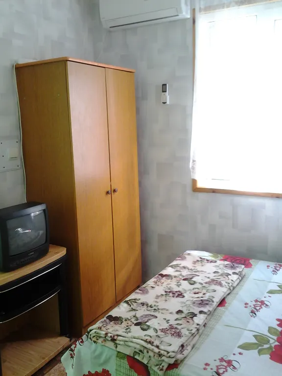 Бюджетный номер, цена и качество соответствуют. Кондиционер работает, охлаждает хорошо. Номер небольшой, для двоих вполне подходит. Напор горячей и холодной воды хороший. Телек не включал, не до него) Внизу есть кухня с холодильником, гладилка с утюгом, газовая плита. Хозяином доволен! Фотки соответствуют.