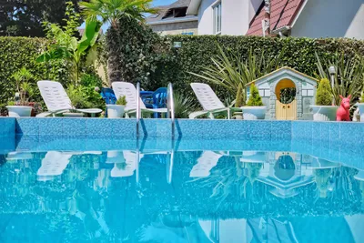 большой бассейн с подогревом, шезлонги, столы под навесом. Парковка (бесплатно).