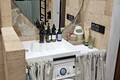 Сушилка над полотенцесушителем раскладывается, есть и обычная стандартная, если нужно посушить большие пляжные полотенца. Несколько порций стирального порошка включены в стоимость аренды. Гладильная доска располагается за зеркальной дверкой (она сдвигается влево по типу шкафа купе). В тумбочке вы найдете утюг, тазик, аптечку, горшок для маленьких гостей.
